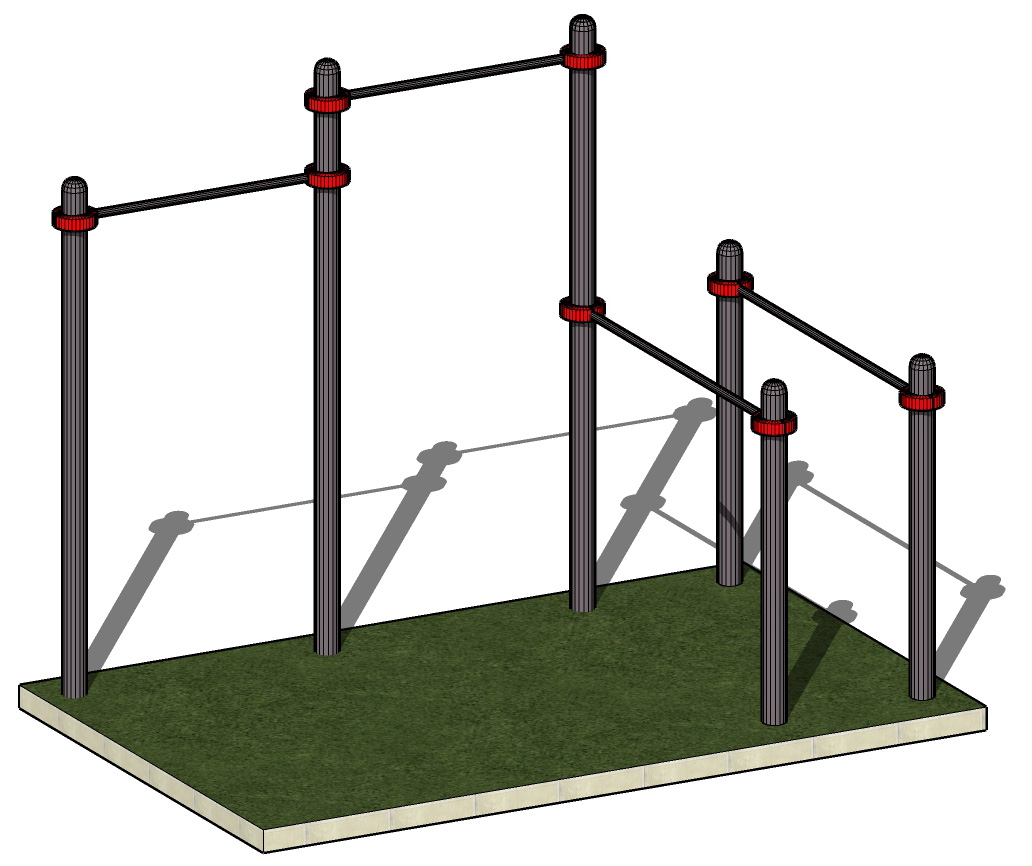 К опорным столбам высотой 2600мм, 2300мм в крепится с помощью хомутов на высоте от уровня основания: 2550 мм, 2400 мм перекладины турника шириной 1200 мм, брусья фиксируются на высоте 1400-1500 мм от уровня основания.